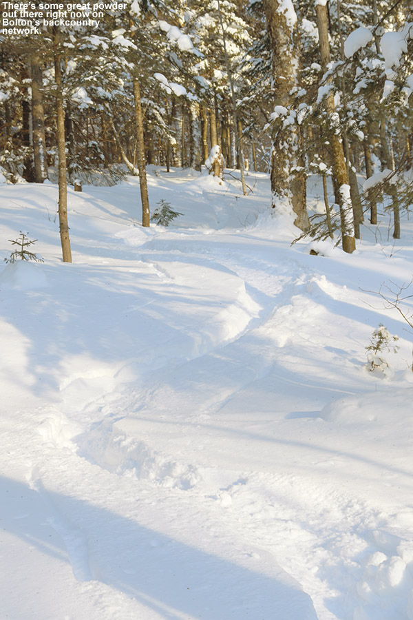 An image looking down the Spillway trail on a ski tour in May at Bolton Valley Resort in Vermont
