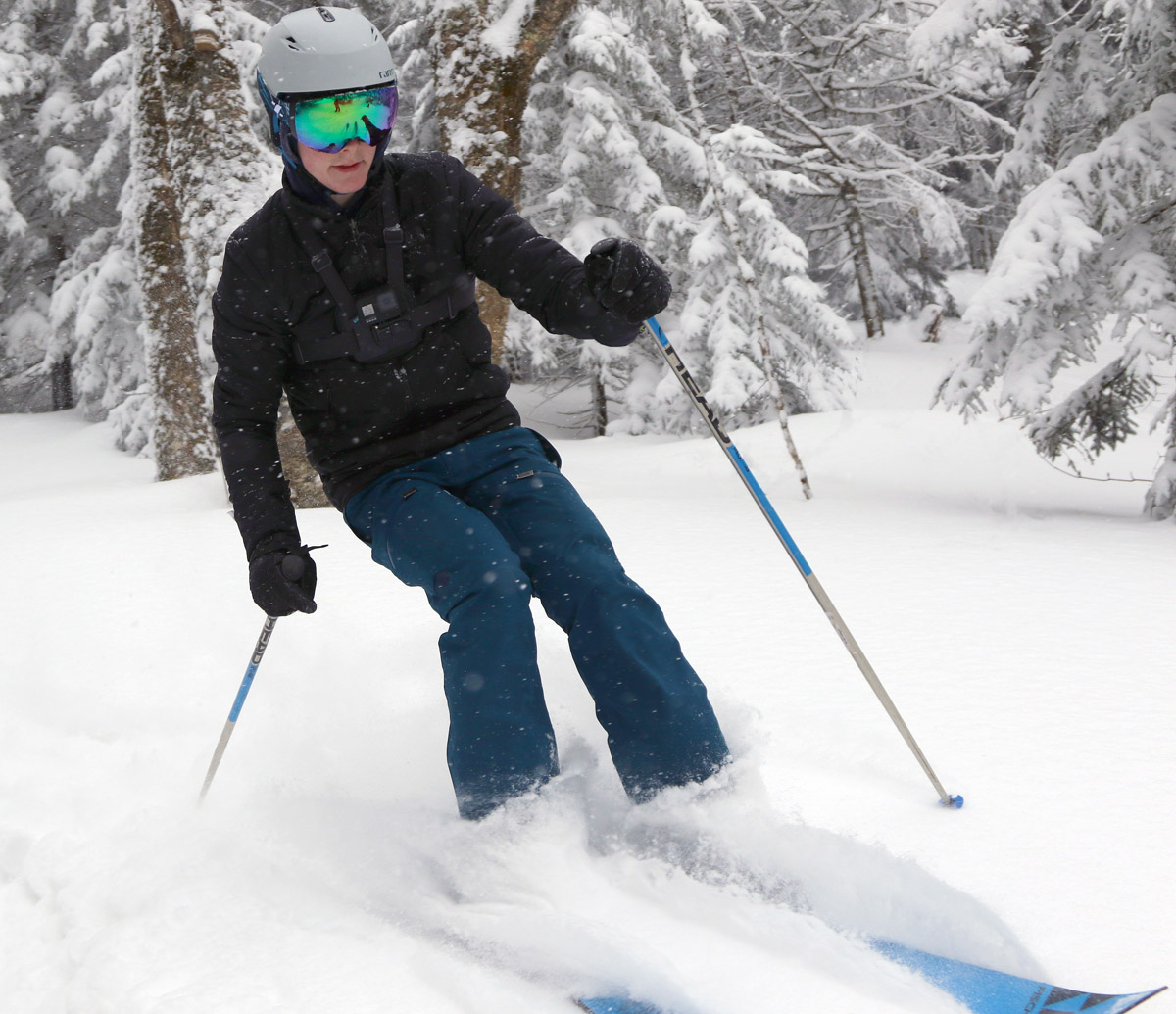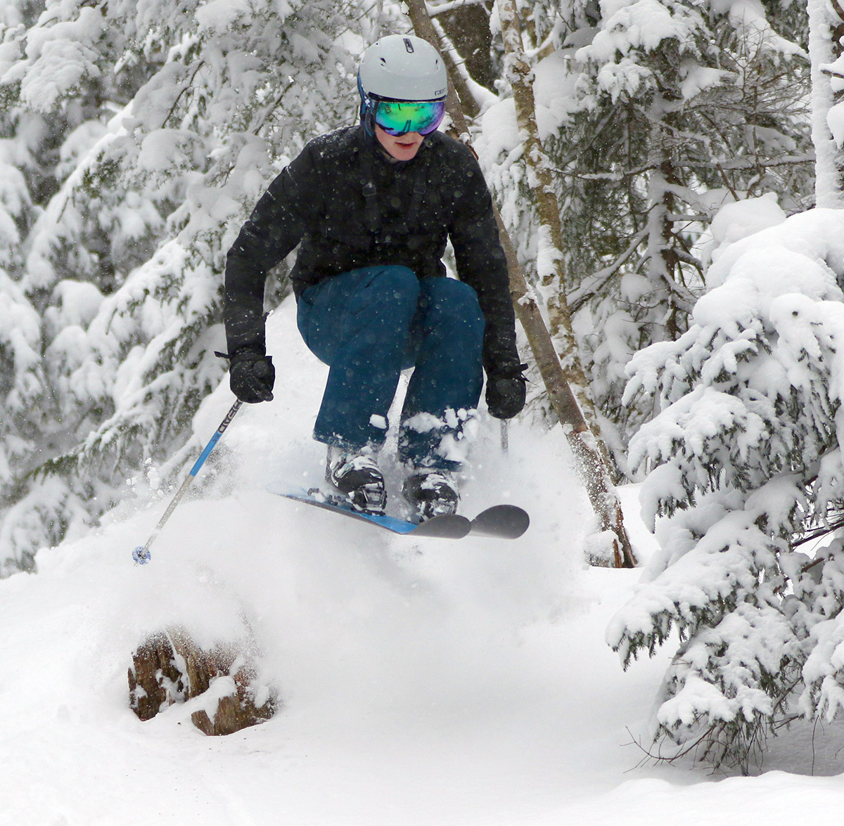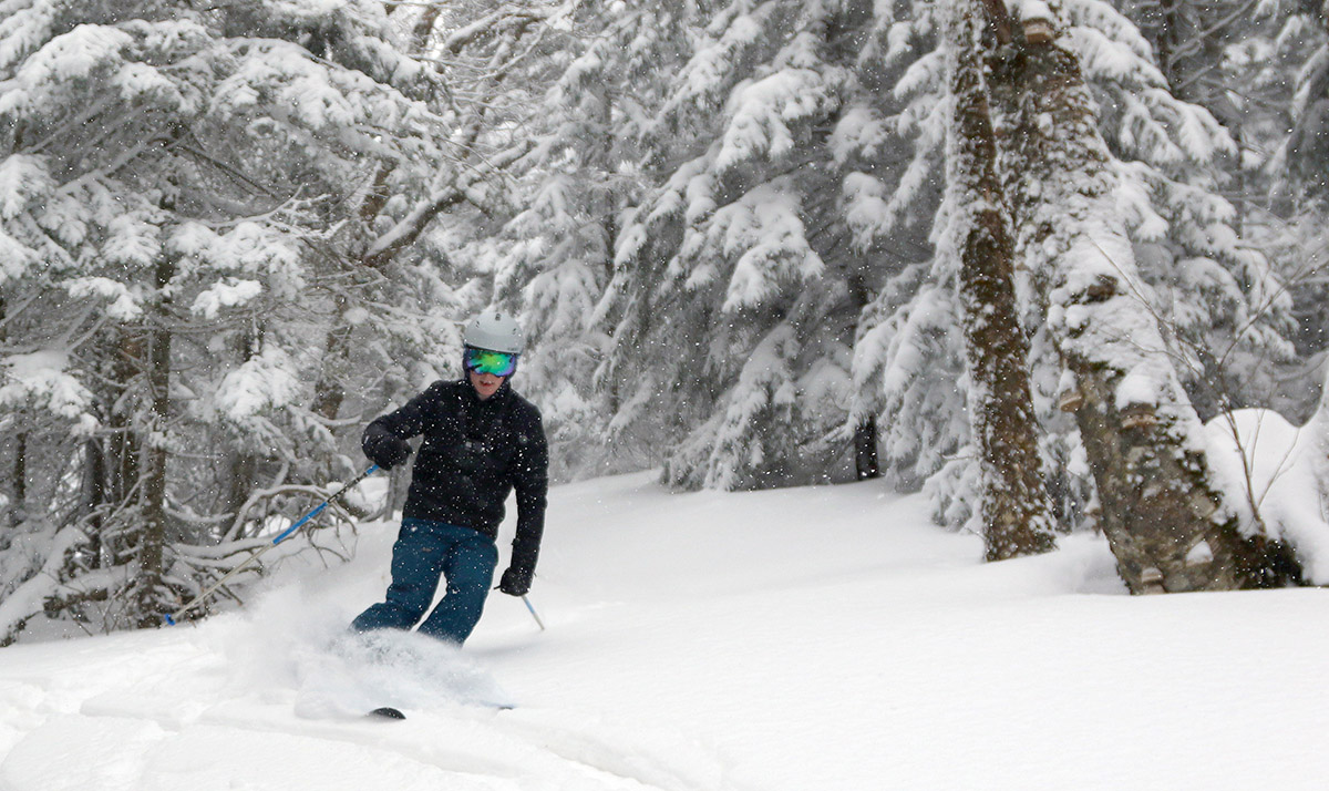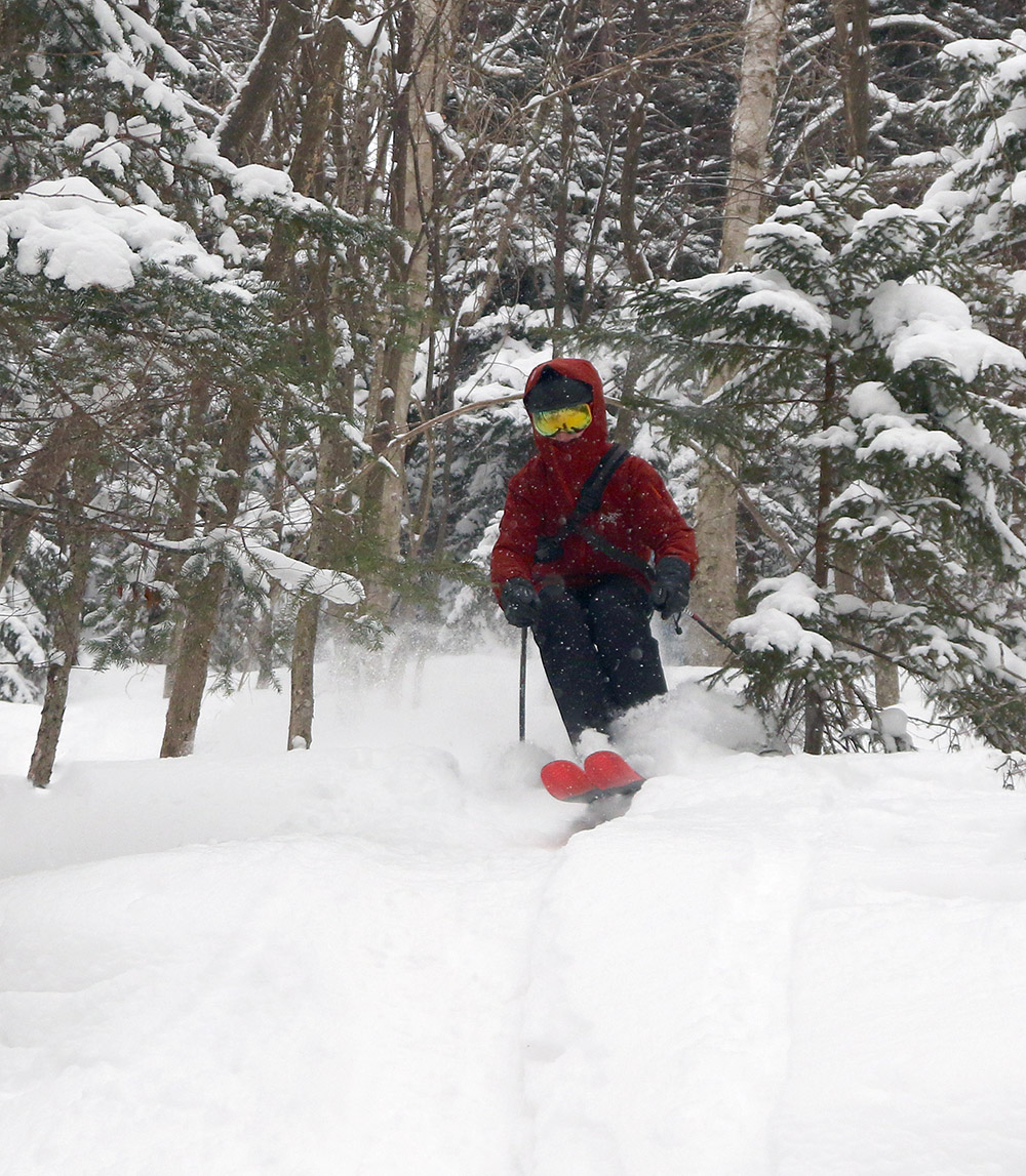 With the new snow not coming in until mid-morning, we’d planned on a late morning start up at Bolton Valley. That timing worked out well, because they’d already picked up a few additional inches from the intense snowfall. And, the snow that had just fallen was the perfect consistency to top off all the powder that was already out there – my morning liquid analyses from the house revealed that the snow came in at just 1 to 2% H2O. So, it was incredibly dry and set up some excellent right-side-up, bottomless powder skiing.