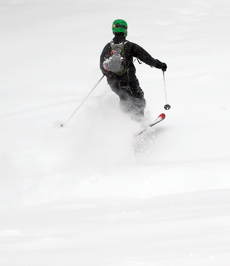 There was definitely a bump in powder depths even compared to what we skied yesterday thanks to the additional overnight snow and the new snow that was falling. One obvious clue that depths had increased was the fact that the snow was now getting a bit too deep for low-angle terrain. Moderate angle and steeper terrain are now providing the best powder turns. I had a feeling we’d be getting to that point today, and indeed while I’d been on mid-fats for the past few days, today I bumped up to the fat skis and that was the correct call as long as you were skiing untracked snow.