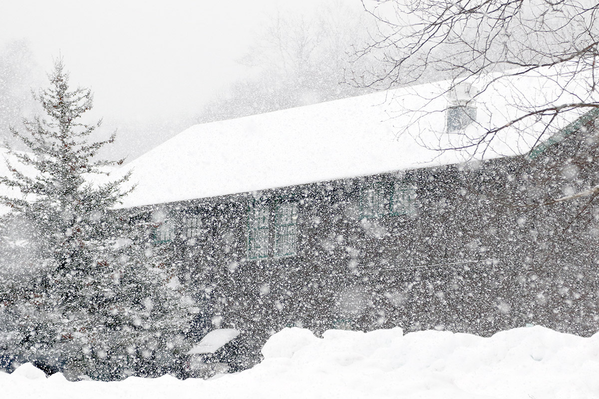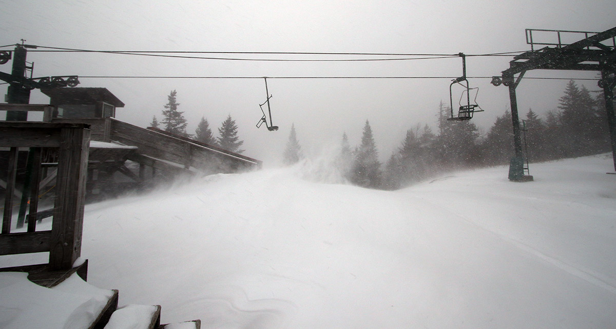 An image of heavy snowfall from Winter Storm Heather at the Timberline Base Lodge at Bolton Valley Ski Resort in Vermont