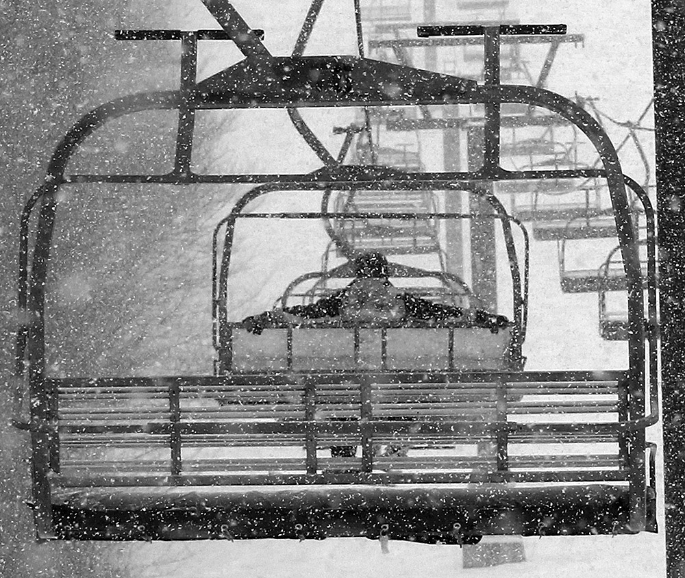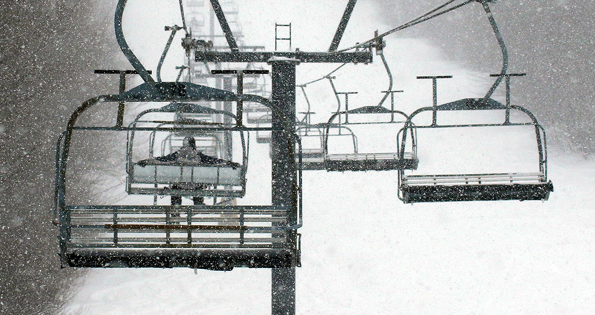 An image of the Wilderness Double Chairlift with light accumulations of snow from a recent small weather system at Bolton Valley Ski Resort in Vermont