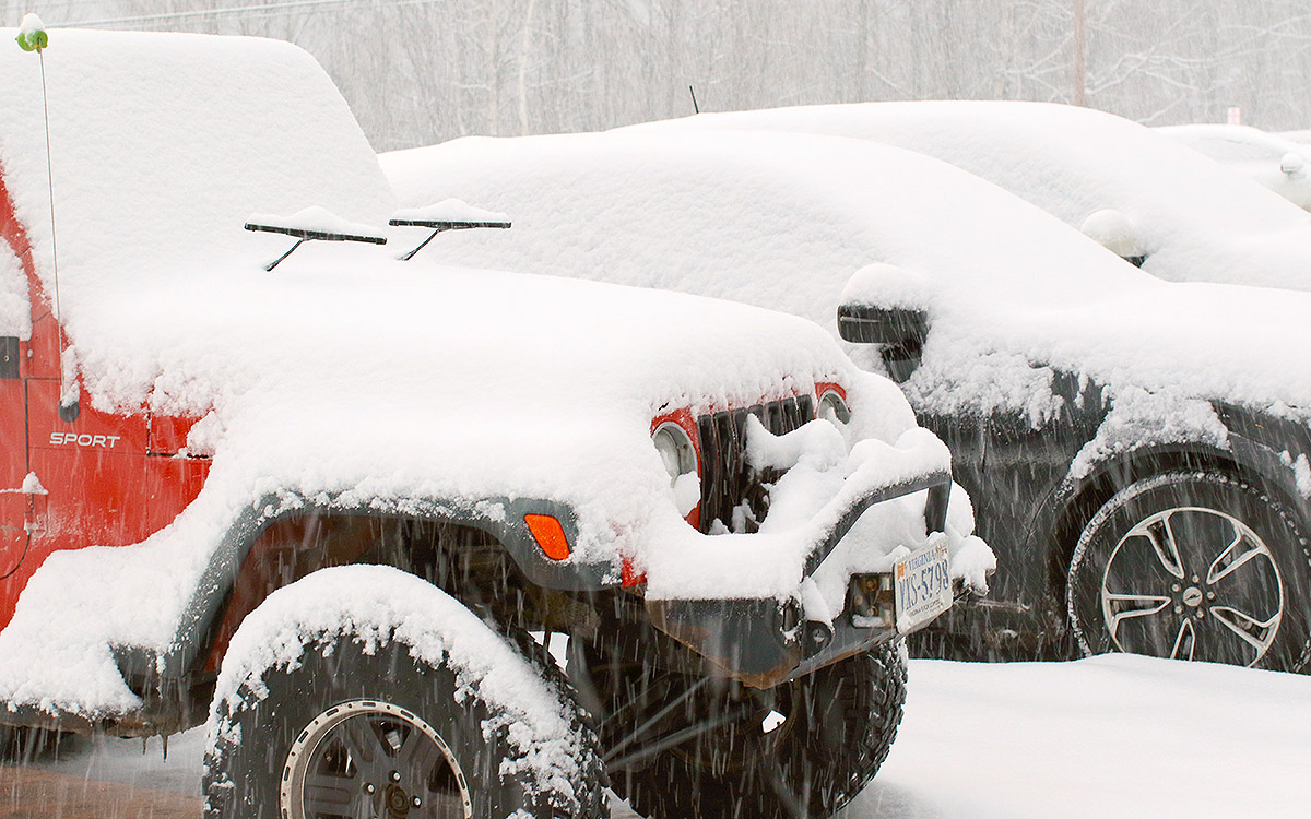 An image of heavy snowfall and accumulations on vehicles in the Timberline parking lot during Winter Storm Heather at Bolton Valley Ski Resort in VermontIt was pounding 1-2”/hour snow the entire time we were on the mountain, so one could easily tack on another couple inches or so to the storm totals by closing time, and it even kept snowing into the evening.