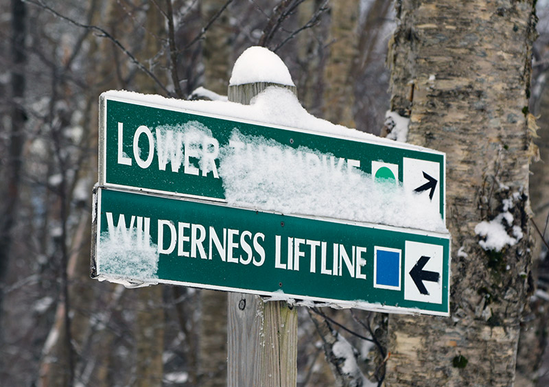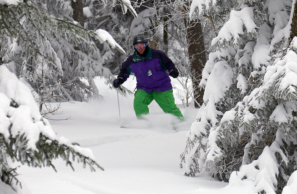 The upslope winds were roaring all throughout the resort, and the Vista Quad was not likely to get off wind hold at all during the day, so we spent our entire session down at Timberline. Relatively speaking, the lower elevations of Timberline meant that the winds were at least somewhat gentler, and the temperatures a bit warmer. And, temperatures were low enough everywhere for even the lower elevations to continue pulling in cold smoke powder, so Timberline was definitely the place to be. Even calling the weather “cold” is relative though – we’re talking “March cold”, which is nothing like “January cold”. Temperatures were well up into the 20s F and quite pleasant. There were no lift queues for most of the morning, so it was simply hop on and run laps until we approached late morning when more people started to arrive and others realized that Timberline was the place to be. We did overhear conversations from people who were arriving from other resorts like Stowe that were having wind hold issues as well.