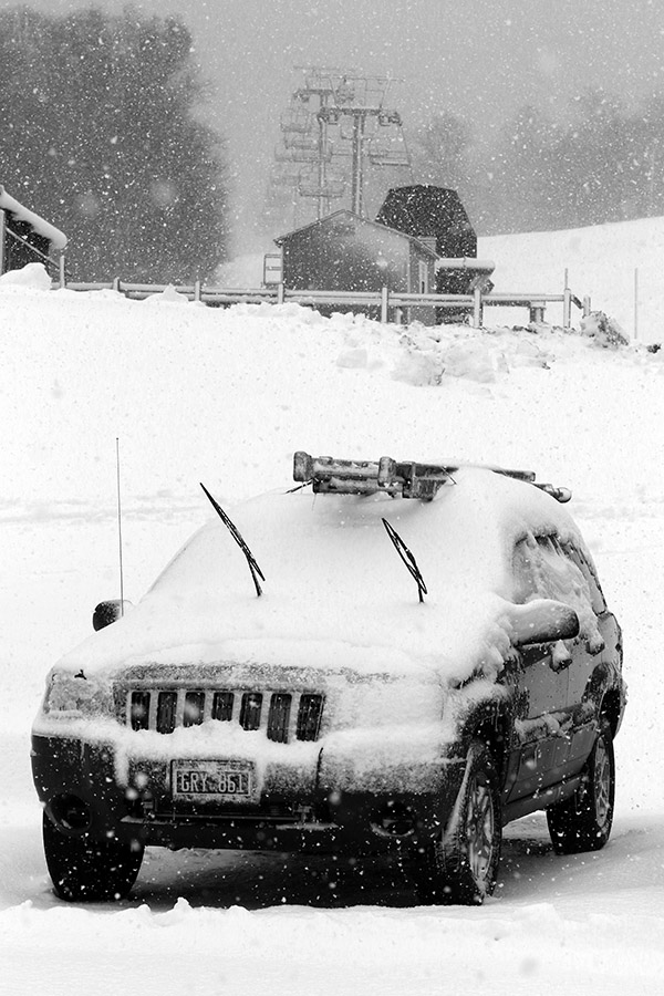 It was snowing all the way down to the valleys this morning, but not necessarily accumulating too efficiently in the lower elevations. Up above 2,000’ in the Village though, snow was accumulating easily. Snowfall was moderate and steady in roughly the ½” to 1”/hr. range when I first arrived, but by the time I’d made my first run and worked my way over to Wilderness, it had picked up substantially to somewhere in the 2”/hr. range. It was the type of snowfall that covers you in white flakes in mere moments if you aren’t moving around on the lift enough to shake it off.