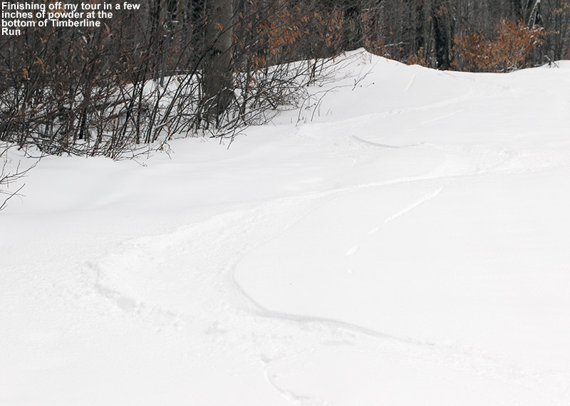 I was up at Bolton Valley this afternoon skiing with Ty, and one notable, and surprising improvement was in the powder. As I mentioned in yesterday’s report, the powder skiing was decent, but not outstanding because the snow density was so homogeneous throughout its depth. I guess Mother Nature just needed a bit of time with that new snow because as of today it had settled beautifully into a more right-side-up powder stack that skied much better. Ty and I dug into the snowpack and checked to see what had changed: the first roughly half foot of powder had dried out, and the snow below it had settled into a smooth density gradient, presumably due to compression from the snow above. At ~2,400’ elevation on Wilderness we found roughly 18 inches of powder before you hit what I’d say was a layer resembling a subsurface.