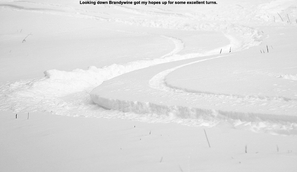 For my descent, I skied a bit of Not a Trail, took the Not a Trail high traverse, then dropped into a nice line that brought me across North Slope and down to Gardiner’s Lane. From there I headed to Gotham City, and since the weather has been so cold and snow preservation so solid, I decided to check out the south-facing Alchemist glade. That area typically suffers from coverage in sunny and warm conditions, but we haven’t had much of that lately, and coverage was excellent. Since our most recent snow, there were only a couple of new tracks in the main Alchemist lines, but there were a number of older tracks that had packed the snow down a bit more, so I ended up heading off to some ancillary lines on the skier’s left. I found acres of terrain over there that was virtually untracked, and it was so good that I put my skins back on and made a quick second ascent via one of the descent tracks on Alchemist to get in another run.