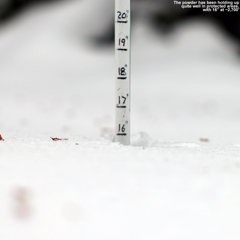 Snow depth increased to over 20” as we ascended, and the snow was substantial enough that it provided both excellent base snow and surface powder for skiing. I’d say it was denser snow overall than what we had back from that storm on the 5th, but the powder skiing was still quite good. We found that the snow did get a touch denser below 2,000’, so you had to be on top of your turns a little more in those elevations as you finished the descent. Dylan was going to head to Bolton for a tour yesterday, but I suggested that he pop over to Mansfield instead, since Stowe isn’t open for the season yet and it’s an excellent time to get in some turns there. We were able to meet up with him and Ronan at the start of their tour, just as we were finishing ours. I passed along the info what we’d encountered with respect to snow conditions, and he said they had an excellent tour with some great turns that even brought them into the trees.