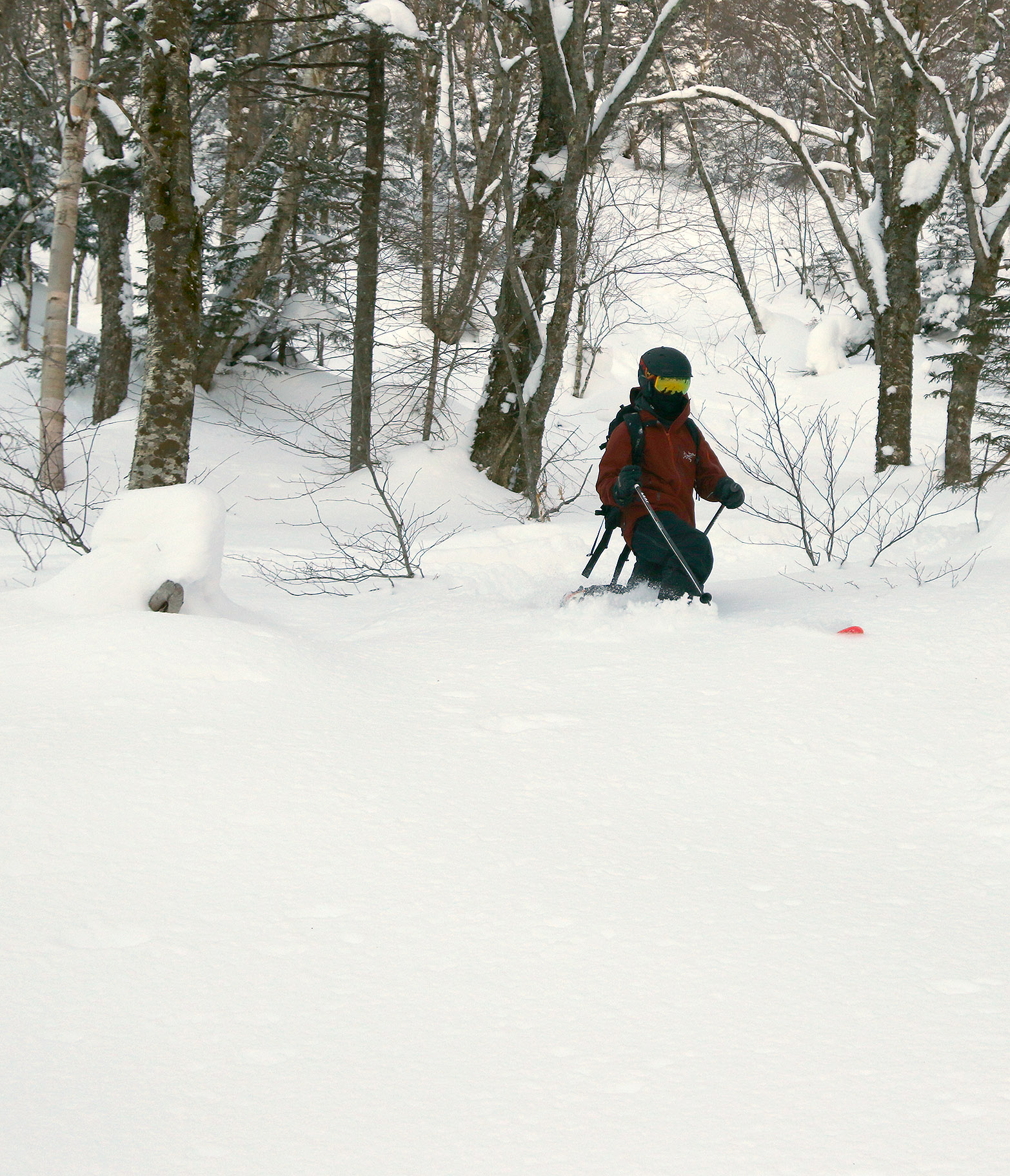 It’s amazing to think that last weekend had been a situation of rain, warm temperatures, and a refreeze that turned the entire snowpack into a solid, crusty mess. From where we were standing, it was basically bottomless powder, a situation in which removal of snowshoes or skis meant trouble standing. The pitch of our descent started off mellow, with various areas of hardwood glades and some underbrush at times. The snow was nice and light; I’d estimate its density at somewhere in the 5-7% H2O range. The slope gradually got steeper as we picked lines along the way that looked good and headed in the general direction of our lower shuttle vehicle. Our general descent route is marked by the thick white line on the map. Even with the deep snow, some areas had enough underbrush that they made picking lines difficult. Some areas we quite clear, but a bit of scouting was needed to find them. James picked direction with his usual finesse, and guided us right down to the parking area and our waiting vehicle (Dave’s pickup truck).