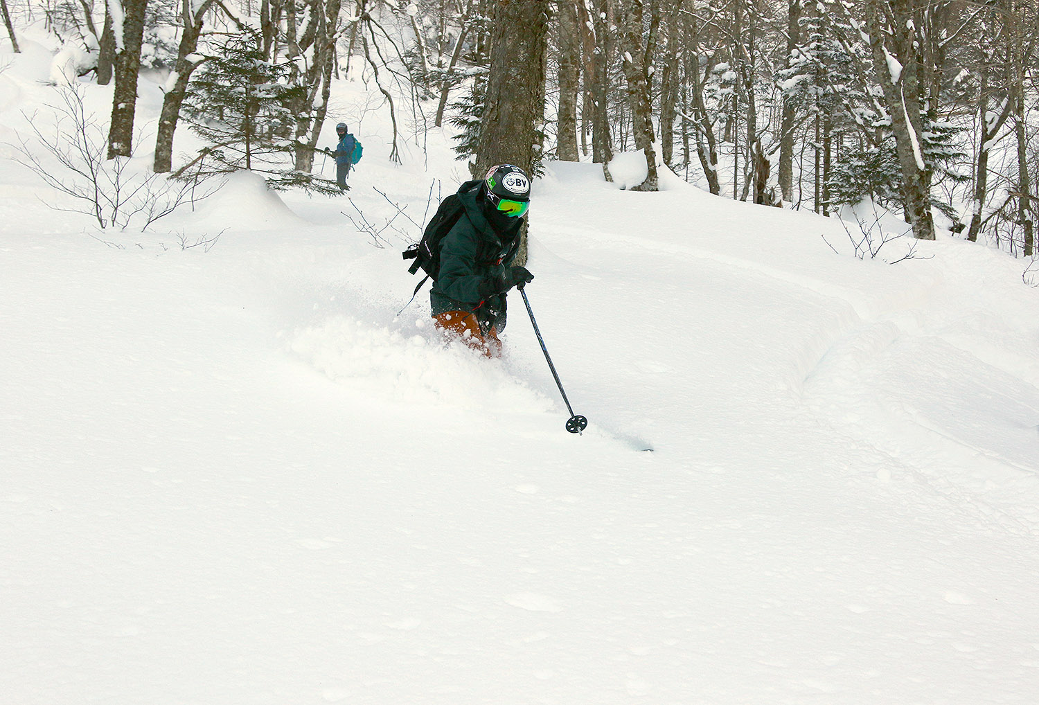With all the new snow, the mountain did indeed have quite a bit of its terrain open, so I definitely wanted to get the boys out for some farther-reaching explorations over toward the Stateside area. From the top of the Flyer we followed the usual Northway Route, and on the way noticed a skier come down from one of the untracked trails above us. He was skiing some of the dense powder up there, and although he only sunk into the snow a few inches, it looked pretty fun. We’d been playing around in the powder off to the sides of the trails a bit, but with it still being somewhat dense and stiff, you really wanted some reasonably large untracked areas to have the best experience. We were eventually lured off Northway to our right, into some terrain in the Catwalk area that hadn’t been groomed; the snow was decent, so we just sort of kept going. We found ourselves above some steep tree lines there, and I was leery of the snow conditions, but Ty really wanted to jump in… so we did. The lines were generally tracked, and we were low enough in elevation that the compaction of the snow was probably for the best, as the untracked snow was getting wet and difficult to ski. Ty and Dylan ripped up the lines though, and we found ourselves continuing on non-groomed terrain all the way to Stateside. There seemed to be just enough snow to cover the natural terrain down to the base with a couple of careful water bar navigations. That last part was a lot of fun, as I knew our general location, but had no clue of exact where we were until we popped out at the base of the Jet Triple Chair. I’ve got a reasonably good knowledge of Jay Peak, and there was definitely enough semi-obscure terrain open to keep us exploring.