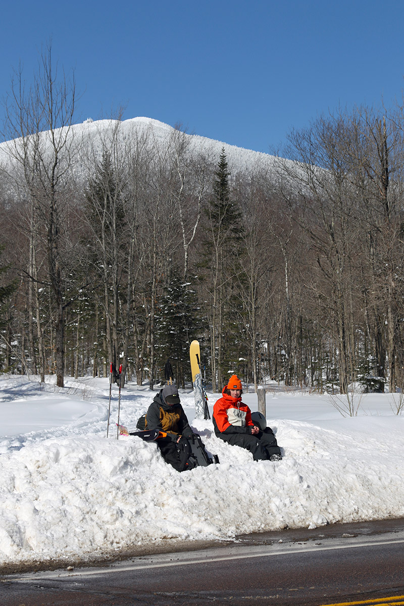 The forecast for the day was looking great – temperatures in the upper 20s F are perfect because it’s warm enough to be quite comfortable out in the backcountry, but below the freezing mark to avoid any temperature effects on the powder. I was concerned about parking since it’s a holiday weekend, but there were plenty of parking spots up at Jay Pass on Route 242. I arrived about 20 minutes before Dylan and his friends, so I poked around at the pass, and checked out the snow conditions and trail access points until they arrived.