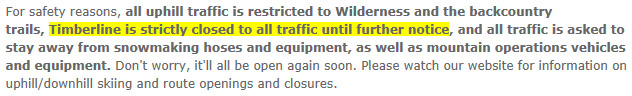 After another run on the tram, we headed over to the triple, and headed for Timbuktu (one of our favorites). We hung to the right to catch fresh snow, but found plenty of ice storm damage in that area, and with the snow that had fallen so far, only very short lines were available, and even then it wasn’t a secure feeling with the fallen trees around. As we headed back left, we found that clearing had been much better, but this area was already getting pretty tracked.
