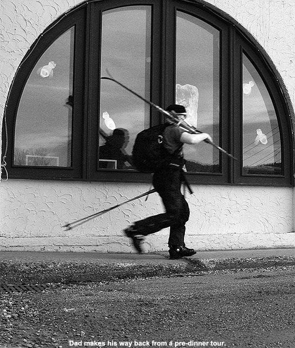 Dad heads back to the Tram Haus Lodge after a short evening ski tour.