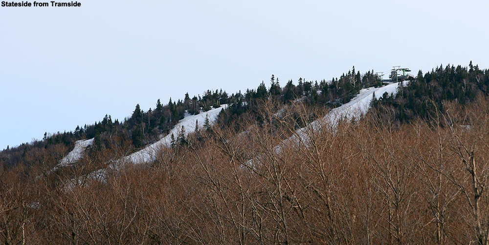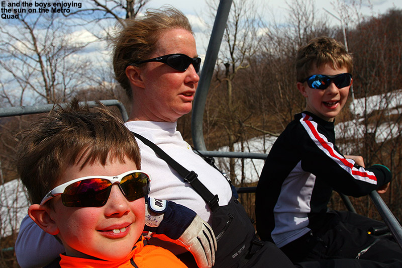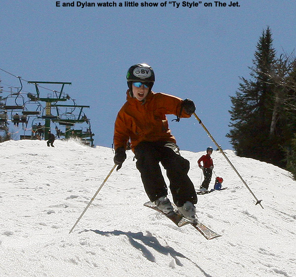 The options for skiing today at Stateside were The Jet and Haynes/Mont L’Entrepide as the steeper routes back down to the base of the Jet Triple Chair, and then another route down Montrealer and Angel’s Wiggle that would bring you right back to near the base of the Stateside Hotel. Snow on the steeper runs was decent, a little thick in spots and a little scratchy in others, but classic, soft spring snow overall. Dylan really fired up some wild skiing for the camera on one of our runs, and was having a blast catching air along the edge of The Jet. It was fun watching from the chair as everyone skied The Jet, and at first we didn’t see any Telemark skiers, but then we started to spot them and some of them were really rippin’ it up. E and I got in a great workout navigating the steep bumps with Telemark turns, and E was happy to get a chance to work on her turns on steeper terrain – she’s often frustrated if we head into steep trees when she’s on her Tele gear, and it’s just too much at once to really get in much practice, but today’s snow and pitch was nice, and she commented on having some great sections where the turns flowed. I found one of the most challenging spots was at the very top of The Jet, where the trail is a bit narrower because it’s constrained by the ropes closing off the top of the lift line so skier’s don’t collide with the chair. There are a couple of huge bump lines, but if you want to ski those while deviating from the obvious troughs, it’s tricky.