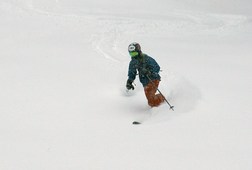 We took an initial run off the Meadows Chair, and indeed the snow was quite good as the boys had said. The groomed slopes had plentiful packed powder, as well as some new loose snow on top from the snow that’s been falling today. We were a little worried about the winds, but we took a run on the Gondola and had some great turns on Switchback. Off piste we found plenty of deep snow, although it was pretty dense with a thick layer a few inches down in some spots.