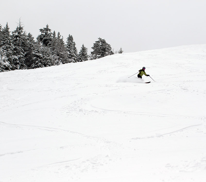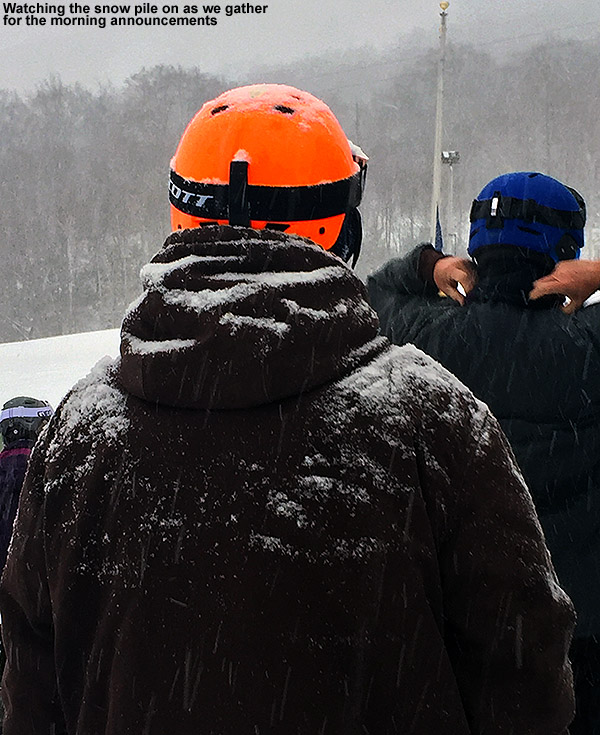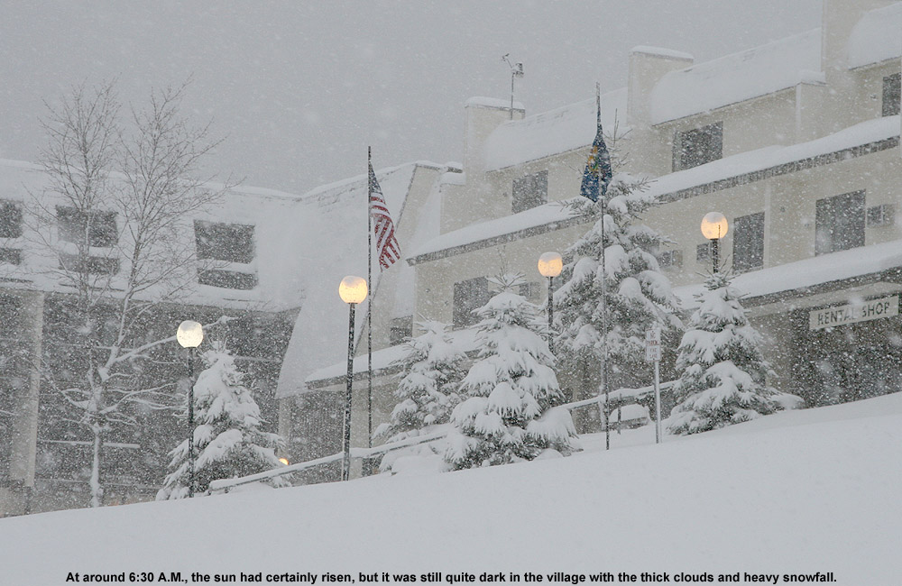 Today, the Sugarbush ski patrol continued applying the same liberal policy that we experienced yesterday with regard to opening trails; if they felt there was enough natural snow to ski them, they just opened them, and today they added Birdland to the mix. We got some of the first “legal” tracks there, which were actually far from the first ones put down on the trail, but they were still quite enjoyable. We followed right behind the ski patroller opening up Birdland as he worked his way down while closing off the side trails; it was certainly fun, and all legal-like. Ski patrol also opened up the North Lynx lift line (bottom 3/4) but it will need some time to bump up for those interested in skiing the great mogul lines that can develop there. Despite today being the canned-food day promotion, crowds weren’t bad at all, since the mountain just kept opening more and more terrain basically as fast as they could get the patrollers to stamp the water bars, close off side trails, and check the padding around the poles (so it seemed). My trail pick of the day, and in fact the whole weekend, would have to be Birch Run off of North Lynx; there was natural snow plus some real nice manmade, and lots of fun terrain without big crowds. All the other members of our Sunday ski posse (Tom “Mango Madness” Bursey, Chris, and E) gave it high ratings. I’m glad North Lynx has had a bit of a revival in the past few years, because there’s some real fun terrain over there. Similar to yesterday, the powder continued to be a bit on the denser side, but that also meant that there was plenty of substance for keeping one afloat. Snowfall continued to fall like Saturday, and it essentially seemed to snow all weekend on and off with a few inches each day.