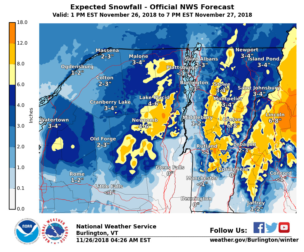 By Tuesday, accumulations were starting to appear in the upper elevations of Mt. Mansfield, with snow levels continuing to drop and accumulations jumping as the event continued on into Wednesday.