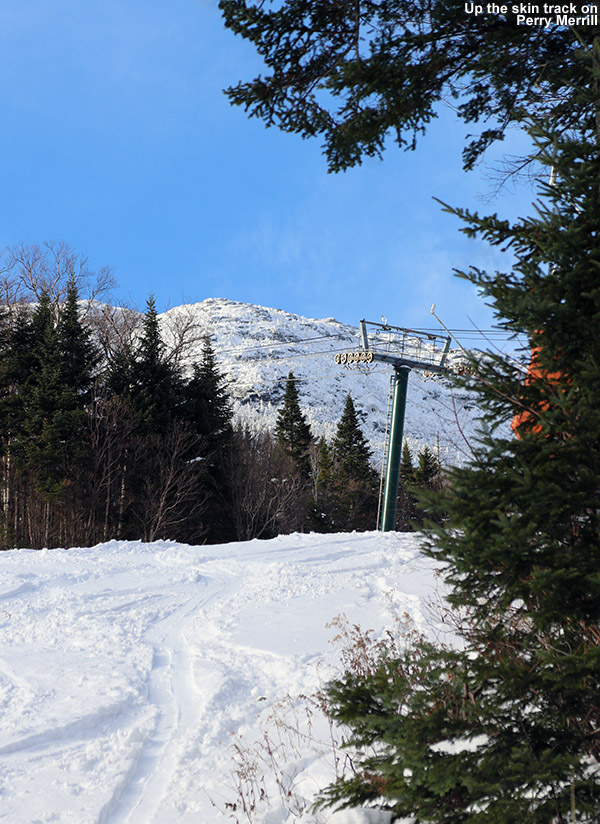 I’d explored the offerings that I wanted to hit by that point, and decided that I’d tour over to Wilderness to finish off the day with some powder. I headed down Alta Vista again, really happy with the way I hit that skier’s left with some aggressive turns. My legs felt warmed up and stronger by that point. On my previous run I’d seen that all the lower routes over to Wilderness were roped off, so the Upper Crossover route was the best remaining option. I knew that anything steep was going to be too much for the current conditions, but I suspected that Peggy Dow’s would be passable, even if I found nothing good above the Old Turnpike area. I caught the bottom portion of Vista Glades, then connected onto Upper Crossover to switch over for the ascent. While putting on my skins, I had time to enjoy the snowy views, which included evergreens that were really starting to take on some healthy accumulations of powder. On the ascent toward the Wilderness Summit, I generally found snow depths of 6 to 11 inches in spots that weren’t scoured by the wind, so there were indeed some good pockets of snow up there.