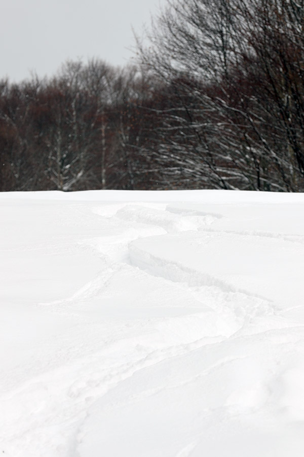 From the quad summit I headed over to the top of the Bruce Trail – a few tracks indicated that some skiers had already skied it today, but I dropped in via an alternate entrance to get an untracked line. The line was pretty steep and I was definitely touching down on the subsurface, but I could tell that I’d be able to get in some good powder turns on some lower angle terrain. The top part of the Bruce wasn’t really all that inspiring today – it’s pretty steep, a lot of pitches face southward, and it’s narrower than I’d thought it would be. I’d say it’s only 10 to 12 feet wide on average in the upper sections, which means that in reality it’s going to be tracked out and packed down after just a few skiers hit it. With its somewhat southern aspect making for spots of poor coverage here and there, it skied even narrower today. The snow was generally skier packed, so my fat Telemark skis were indeed feeling slow edge to edge, and I had to throw in a good number of alpine turns to fit in some of those small spaces dictated by the trail width and coverage.
