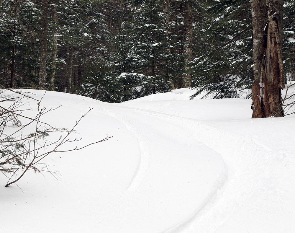 After another run on the tram, we headed over to the triple, and headed for Timbuktu (one of our favorites). We hung to the right to catch fresh snow, but found plenty of ice storm damage in that area, and with the snow that had fallen so far, only very short lines were available, and even then it wasn’t a secure feeling with the fallen trees around. As we headed back left, we found that clearing had been much better, but this area was already getting pretty tracked.