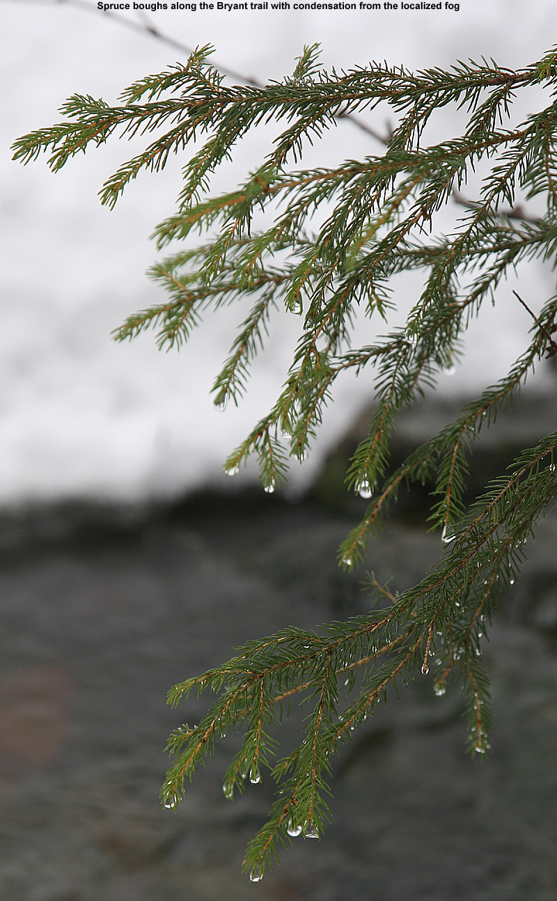 We headed up the Bryant trail and it was a really pleasant ascent. Temperatures were in the 40s F so we stopped frequently for photography to capture the sights. At one photography stop, a couple of patrollers stopped by and we talked for a while. We chatted about skis, cameras, and some of the new glades, and then they headed on their way up to take care of a tree that had fallen onto one of the trails. Coverage on Bryant and in the surrounding backcountry was excellent, with generally a couple feet of settled snow. We did see a couple of small openings in streams along the side of the trail, but they were more an opportunity for photos than anything. Any stream crossings on Bryant were in fine shape and there was no open water across the trail. To check out the rest of the text, images, and GPS track, continue on to the full Bolton Valley Nordic/Backcountry report from today.