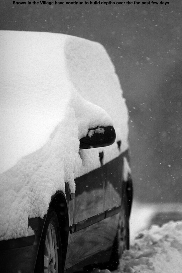 We’d picked up a half-inch or so of new snow down at the house when I headed up to Bolton Valley in the mid to late afternoon. Flakes had been small throughout the storm, so accumulations were coming in a bit on the denser side at around 10 to 12% H2O. I found the same type of snowfall up on the hill, although it was coming down with a bit more intensity. You could see that vehicles had taken on some decent accumulations from the day’s snowfall up to that point.