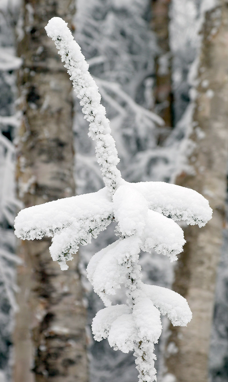 Rime adorns the top of an evergreen, which was a frequent sight throughout my ski tour today.