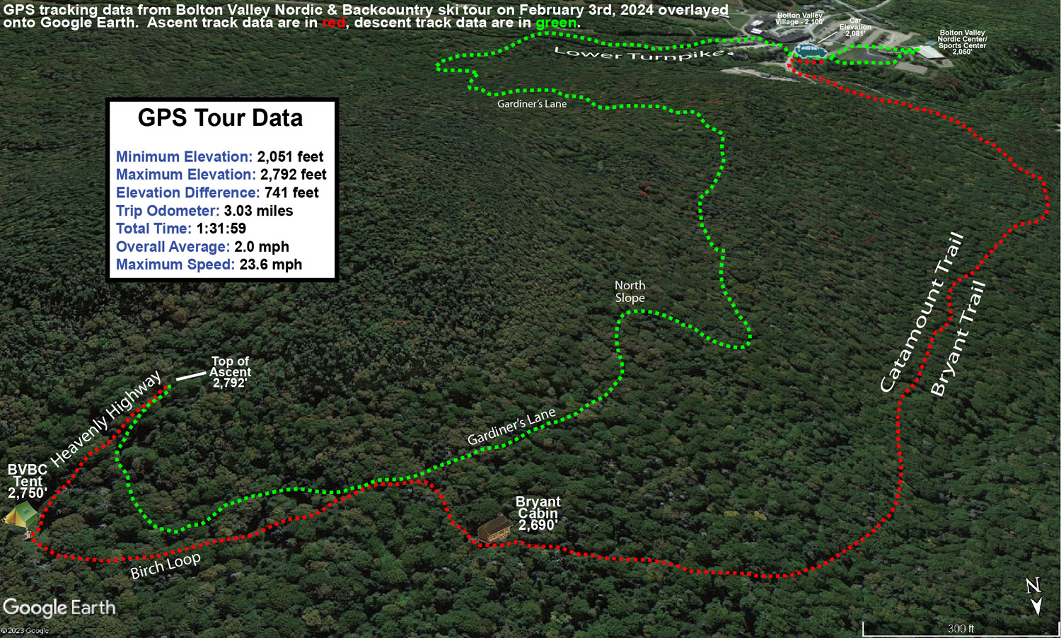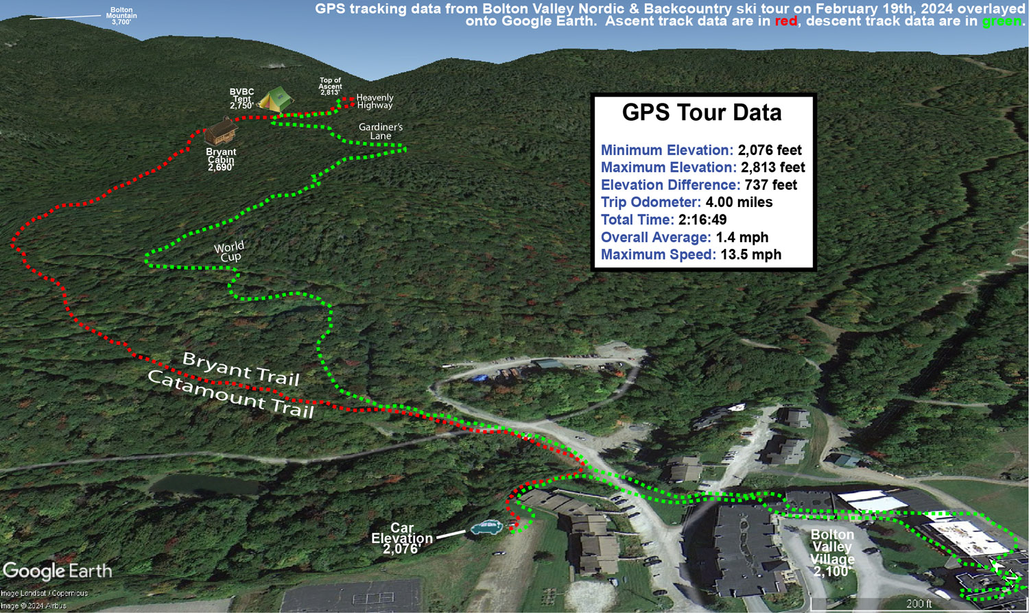 A Google Earth map with GPS tracking data of today’s ski tour out on Bolton Valley’s Nordic & Backcountry Network