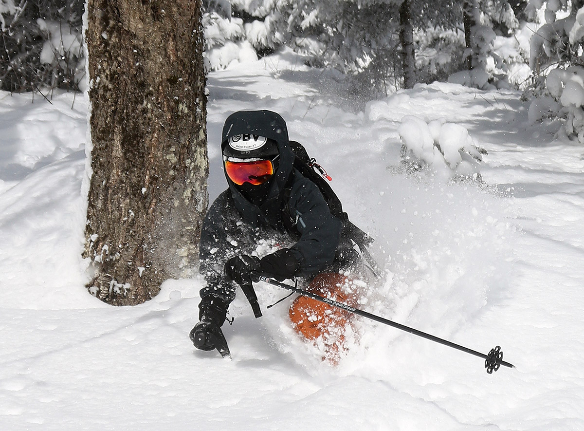 Ty slices through another powder turn as we make our way through the Branches glade area of Bolton’s Nordic and Backcountry Network during part of today’s ski tour.