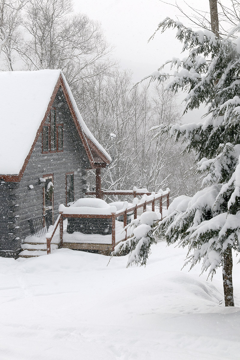 Heavy snowfall envelopes us near the start of today’s ski tour as we pass a cabin near the parking area for the Catamount Trail.