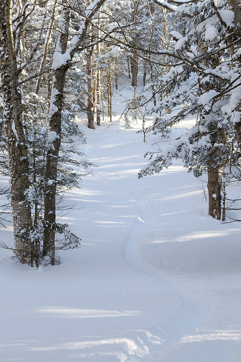 I decided to head up the Bryant Trail to Bryant Cabin in the afternoon, and play it by ear with respect to lengthening my tour, depending on how my supply of daylight was looking. I was well ahead of sunset when I was up at Bryant Cabin, therefore I just continued on up to the Catamount Trail Glades so I could get in some turns in the higher elevations. Based on my recent outings at the resort, I knew that conditions improved a lot with elevation, so I wanted to get a good sampling of the powder up high. I topped out at an elevation of about 3,100’ on the back side of Bolton Mountain, descended through the Catamount Trail Glades, and then traversed back above Bryant Cabin and navigated a route through another half dozen different glades back to the base. Today definitely had a nice midwinter vibe, with bright afternoon sun, temperatures somewhere around 20 F, and great powder.