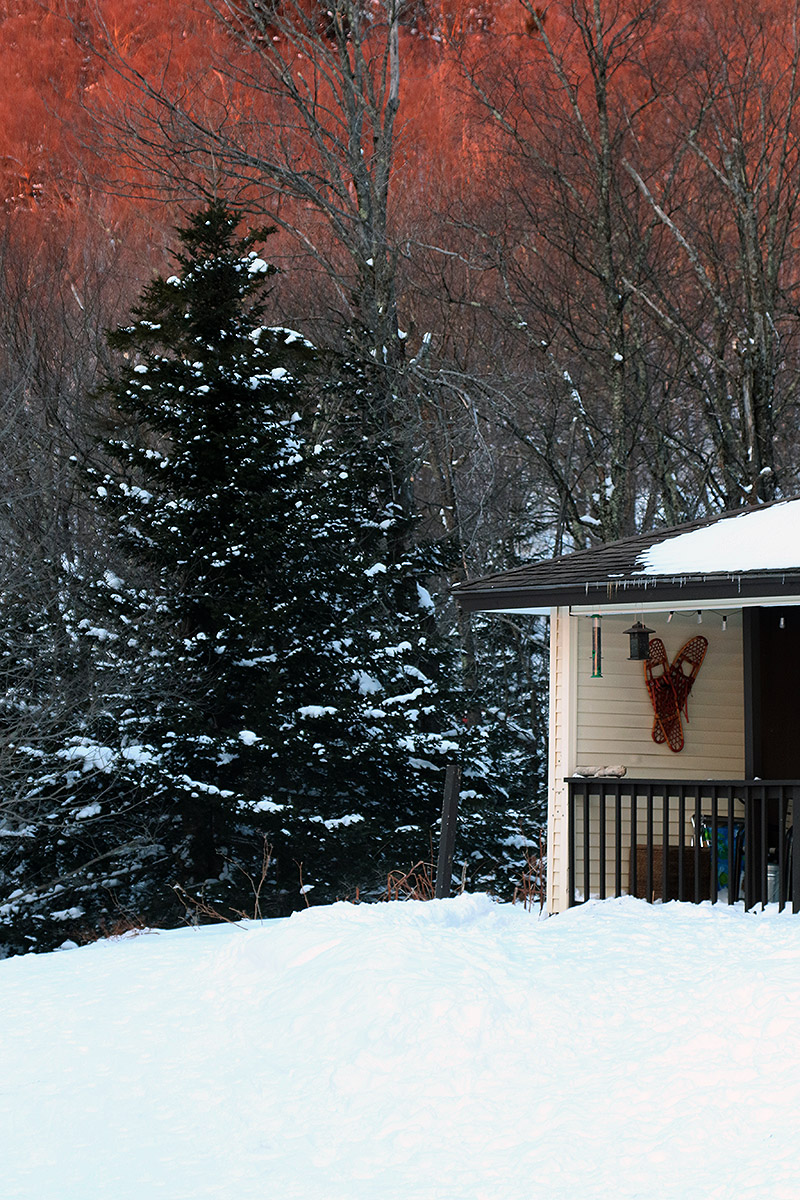 The glow of afternoon sun hits the mountains as I set off past some of the Bolton Valley Village condominiums onto the Nordic & Backcountry Network for a ski tour.