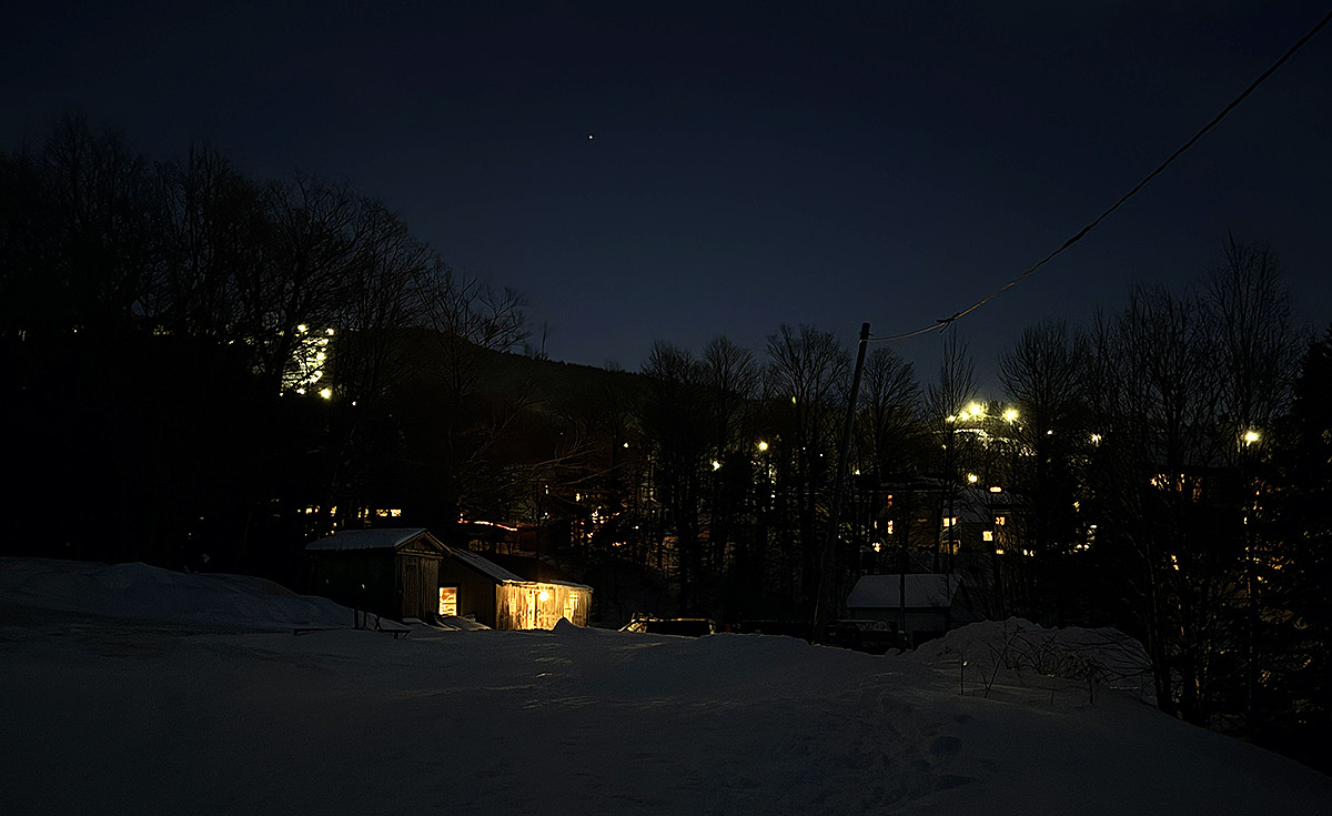 Finishing up my tour in the dark with a view toward the Bolton Valley Village and the ski trails lit up for night skiing