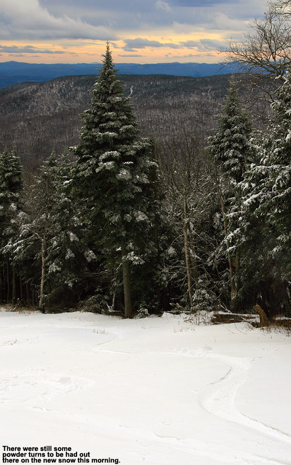 It turns out that the resort did pick up at least a couple of inches of snow based on what we saw, but the accumulations varied a lot with the wind and perhaps their standard measurement spots didn’t hold onto any of the snow to a degree that they felt confident enough to report it. The resort is working on beefing up the manmade base on their main Bear Run beginner route on the lower mountain, so there was no beginner terrain in play today, and I think that helped to keep the number of visitors lower than it might have been. Conditions on their main Sherman’s Pass/Beech Seal route were decent, with some manmade snow of course, but some natural mixed in and a nice amount of loose snow that gave you something to carve on. The relatively low skier traffic kept the morning groomed surfaces lasting longer than they typically might, but by late morning the skier traffic was starting to pick up, and you could tell that the surfaces were getting a little firmer.