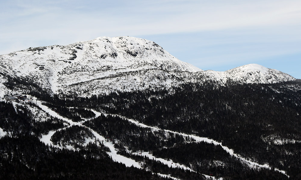The weather had been warming since yesterday, and had risen above freezing in the valley. When we left my parent’s house in Shelburne (elevation ~180’), the car thermometer was reading 39 degrees F. At the bottom of the Bolton Valley Access Road (elevation ~340’) it was at 37 F, and by the time we reached Bolton’s main base (elevation ~2,100’) it was down to 34 F. There was a notable difference in the look of the snow on the mountain when compared to the valley. Down in the valley, the snow was getting spring-like, and had melted off the trees. Up on the mountain, even at the base area, there was a coating of white on the trees, and the snow still looked pretty dry and wintry. Bolton was reporting 2 inches of new snow, which we hoped would make for some pleasant skiing.