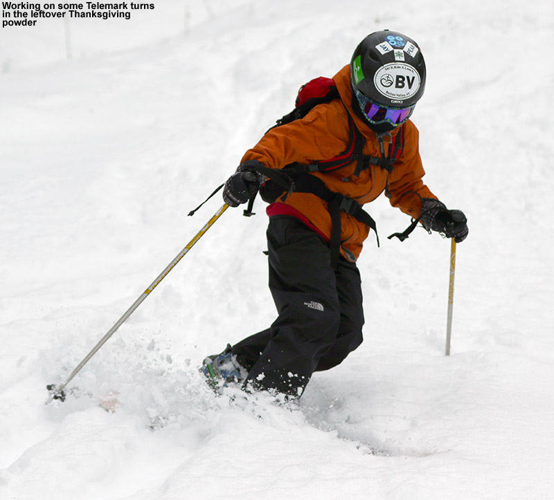 Once on the snow, the boys jumped right into their Telemark turns as if they hadn’t missed a beat, and that’s what we were hoping to see. For Dylan, identifying his strong and weak sides was more obvious, but Ty was really putting down some consistent turns in both directions. The snow was mostly decent corn, but there were a few sticky spots, and a few spots where coverage is getting narrow. We basically had the whole trail to ourselves though, with just a couple other skiers out in the area, and it was especially familiar since it was where we’d had some of our favorite turns when we visited over the holidays.