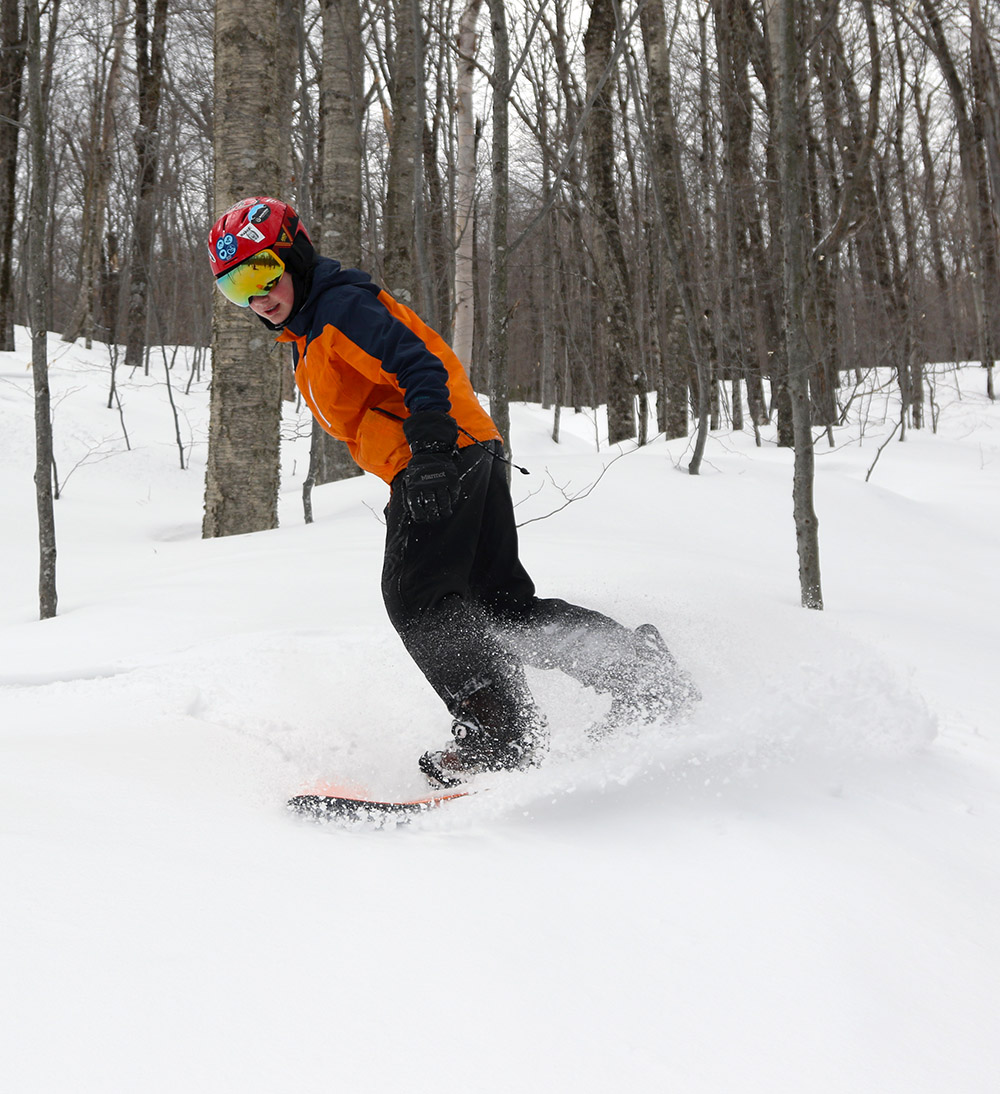 Dylan charges through some of the fresh powder as Winter Storm Ronnie rages on during our session at Bolton Valley today