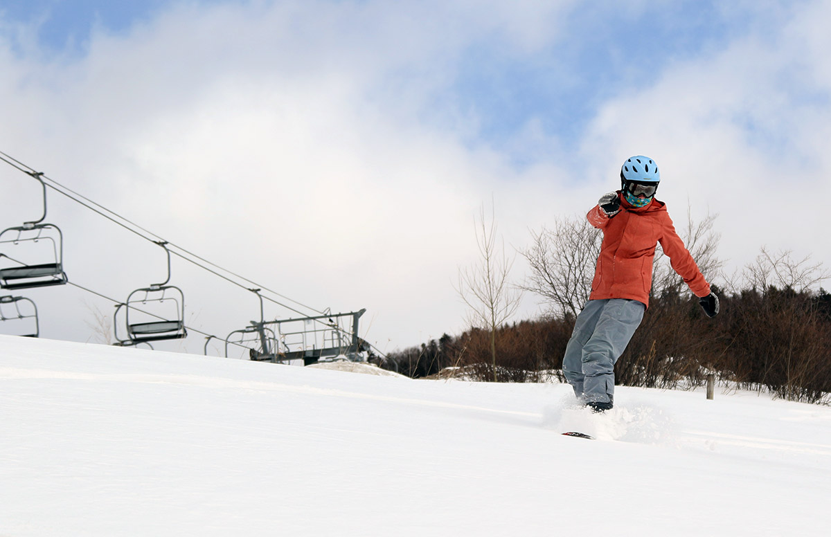 Bolton Valley has been putting up some impromptu mini terrain parks near the base these past couple of weekends with just a feature or two, and it seems like folks are having a lot of fun with that. They’re short enough that you can literally hike back up in 20 seconds and hit the features again. Dylan had fun with the one they have set up near the Mighty Mite and made a couple runs down the rails on our way out.