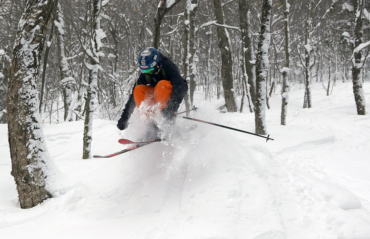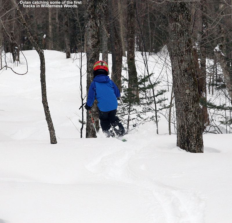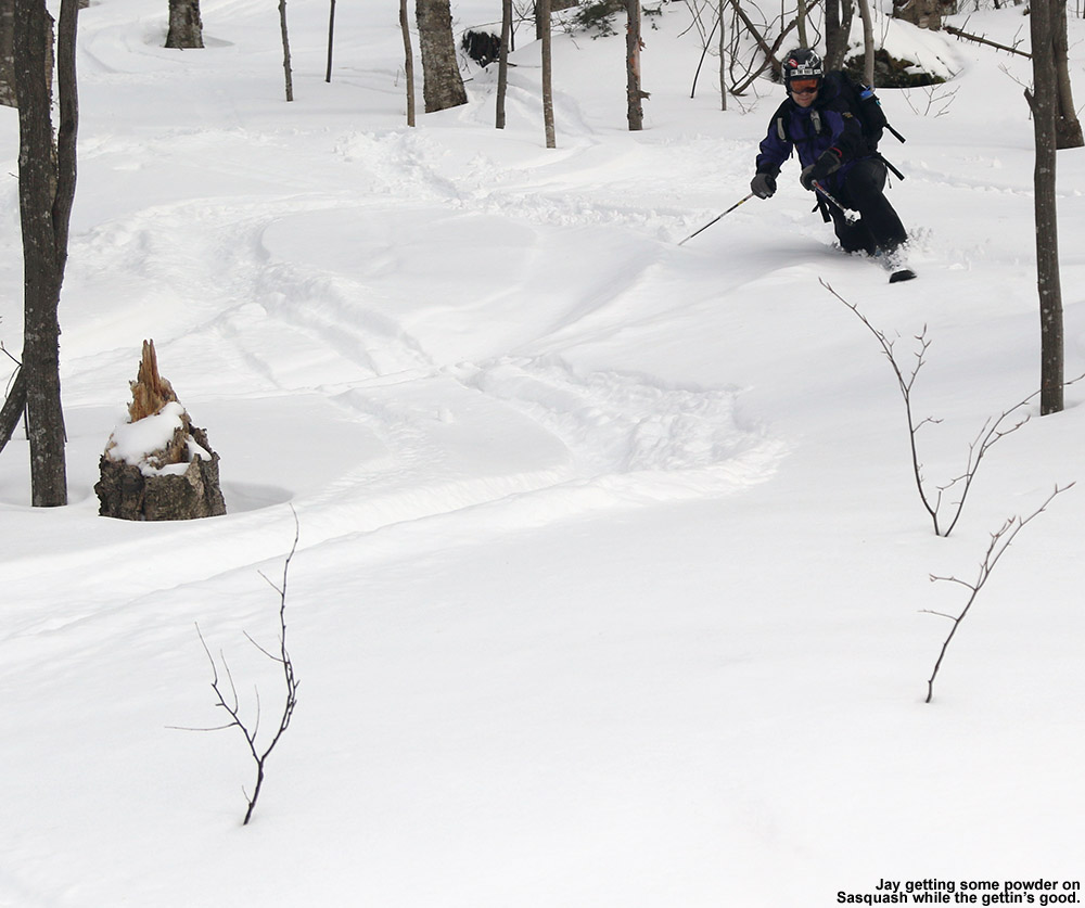 Snow depth increased to over 20” as we ascended, and the snow was substantial enough that it provided both excellent base snow and surface powder for skiing. I’d say it was denser snow overall than what we had back from that storm on the 5th, but the powder skiing was still quite good. We found that the snow did get a touch denser below 2,000’, so you had to be on top of your turns a little more in those elevations as you finished the descent. Dylan was going to head to Bolton for a tour yesterday, but I suggested that he pop over to Mansfield instead, since Stowe isn’t open for the season yet and it’s an excellent time to get in some turns there. We were able to meet up with him and Ronan at the start of their tour, just as we were finishing ours. I passed along the info what we’d encountered with respect to snow conditions, and he said they had an excellent tour with some great turns that even brought them into the trees.